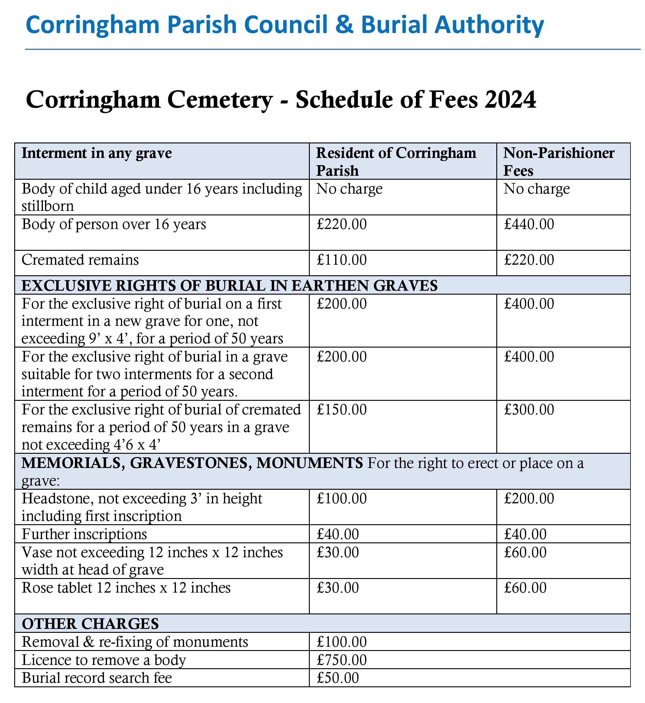 Link to Burial Fees 2024